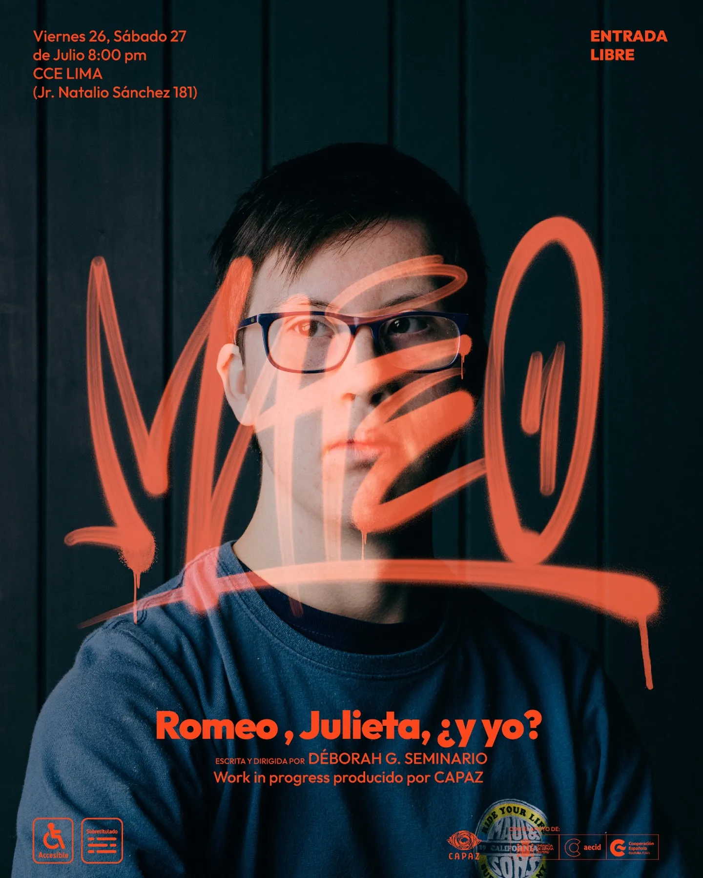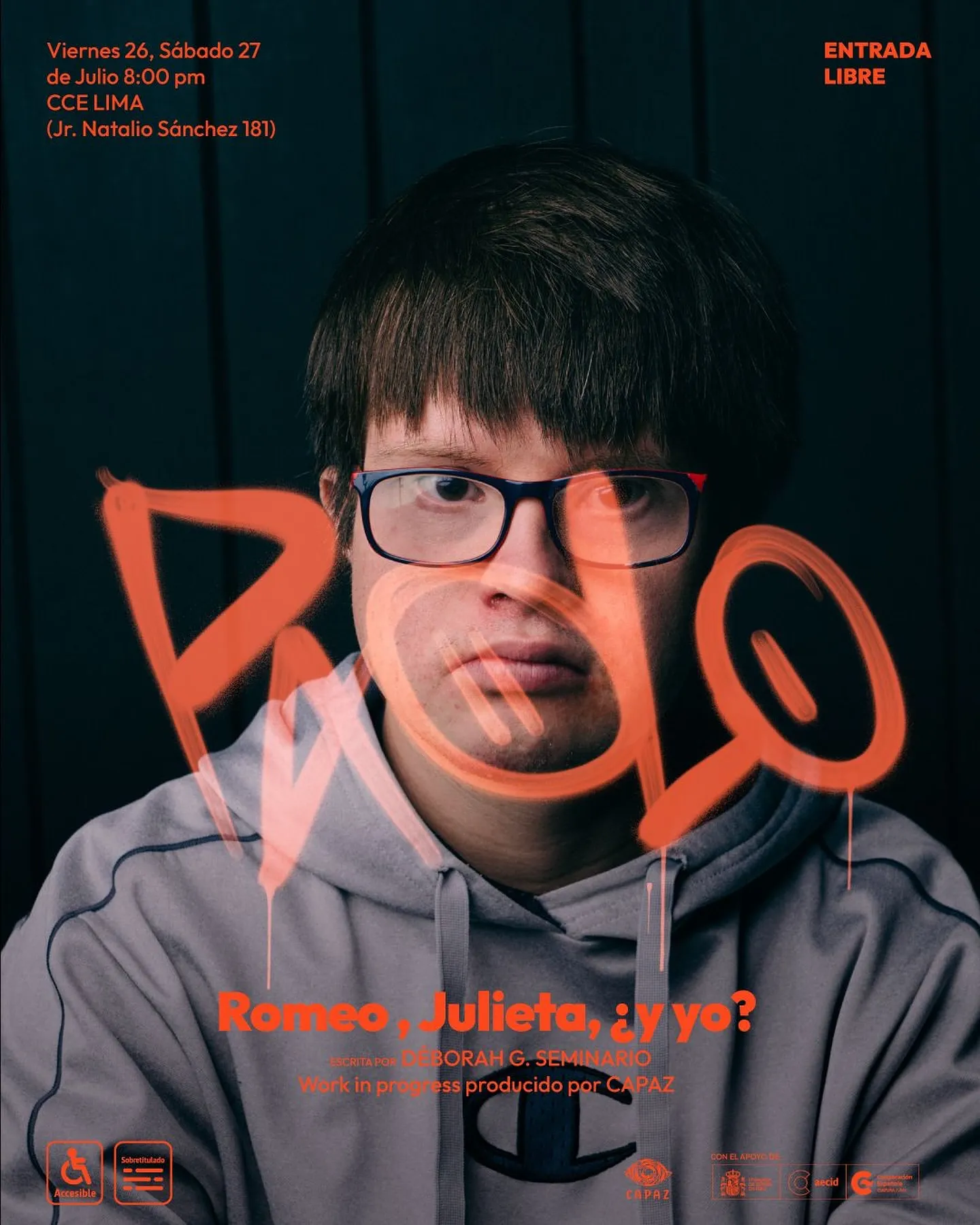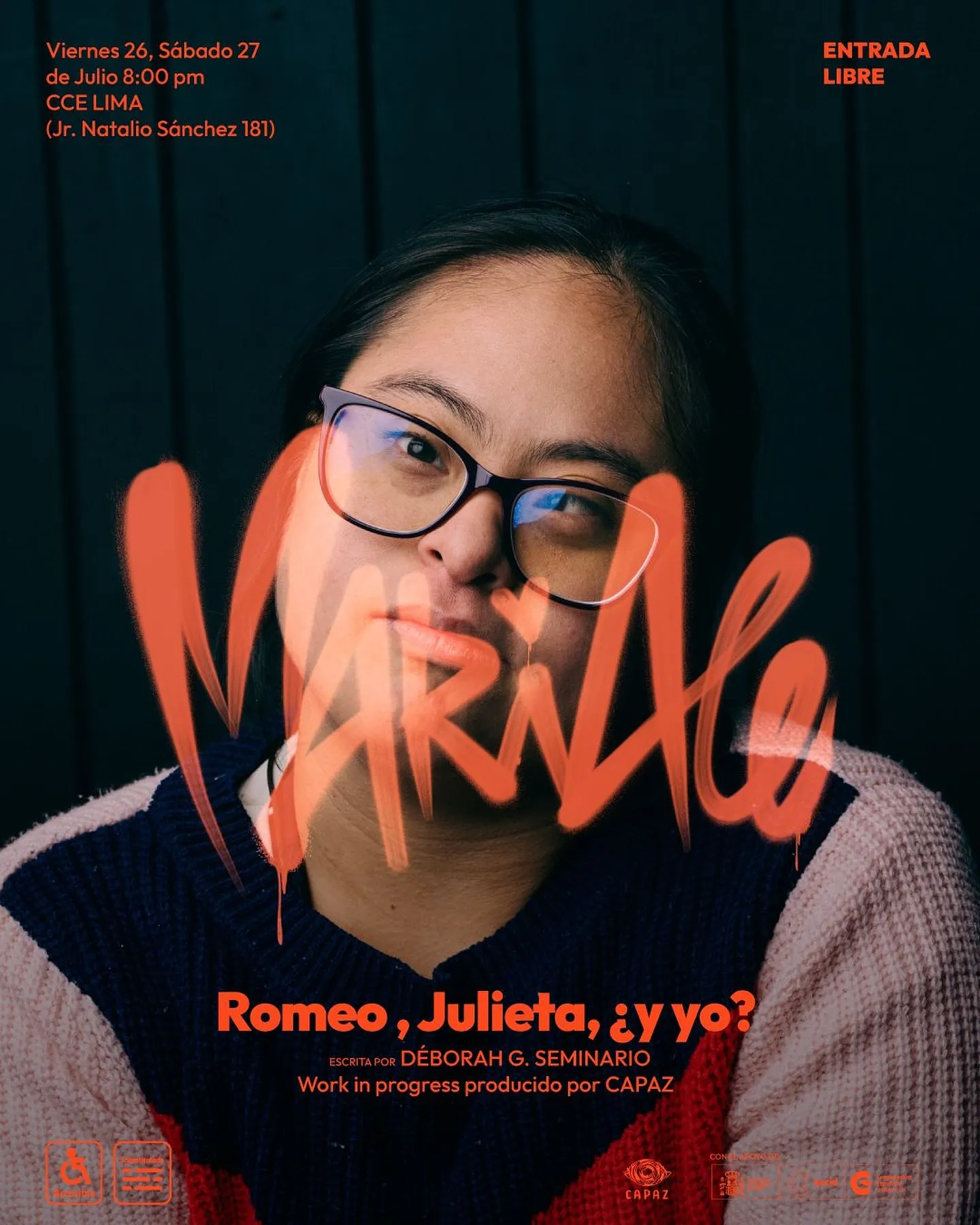 Inspirada en la clásica historia de Shakespeare, Romeo, Julieta, ¿y yo? es una creación colectiva que reinterpreta el amor, el deseo y la amistad desde la experiencia de un grupo de jóvenes con síndrome de Down en diálogo con artistas escénicos sin discapacidad. La obra traslada la historia de Verona a Lima, una ciudad contemporánea, caótica y diversa, donde lxs protagonistas comparten sus búsquedas personales, afectivas y sexuales con humor, ternura y autenticidad.