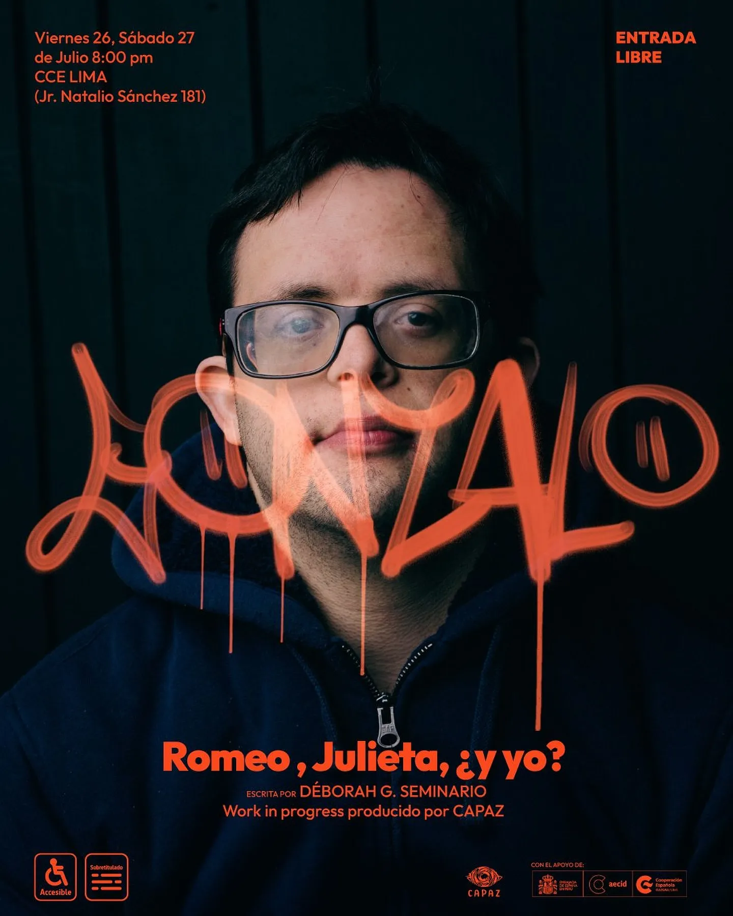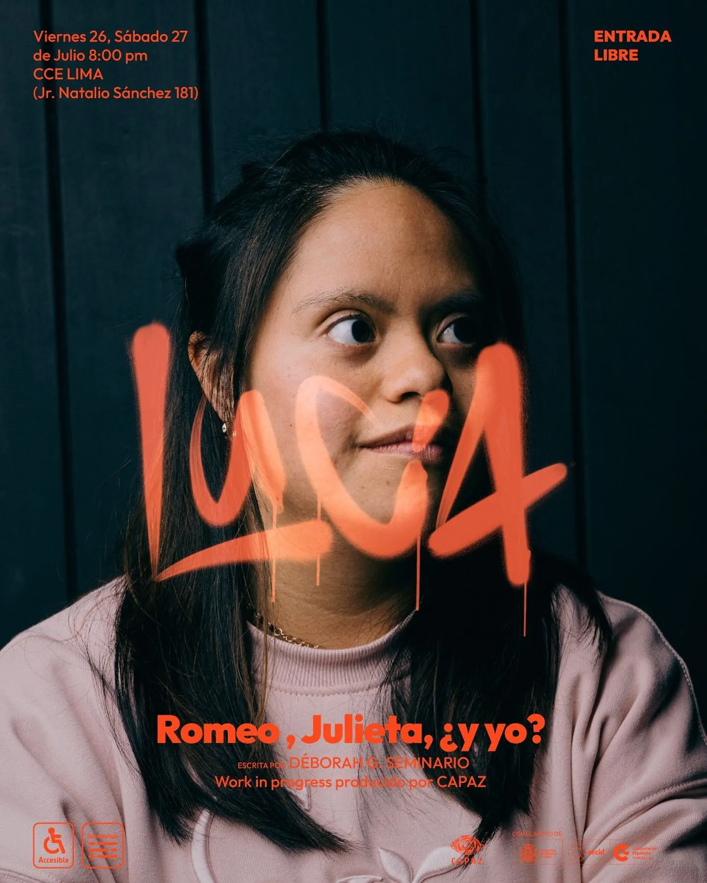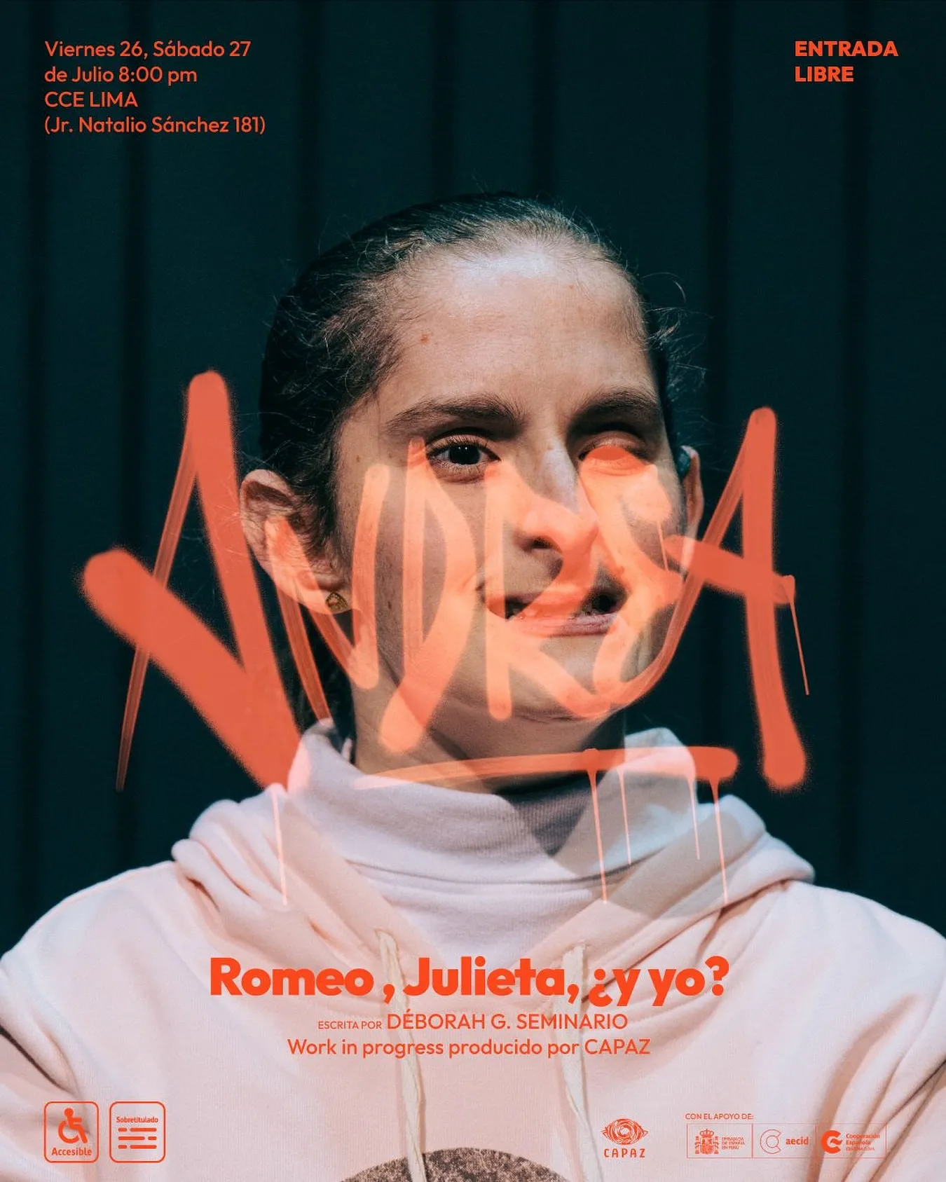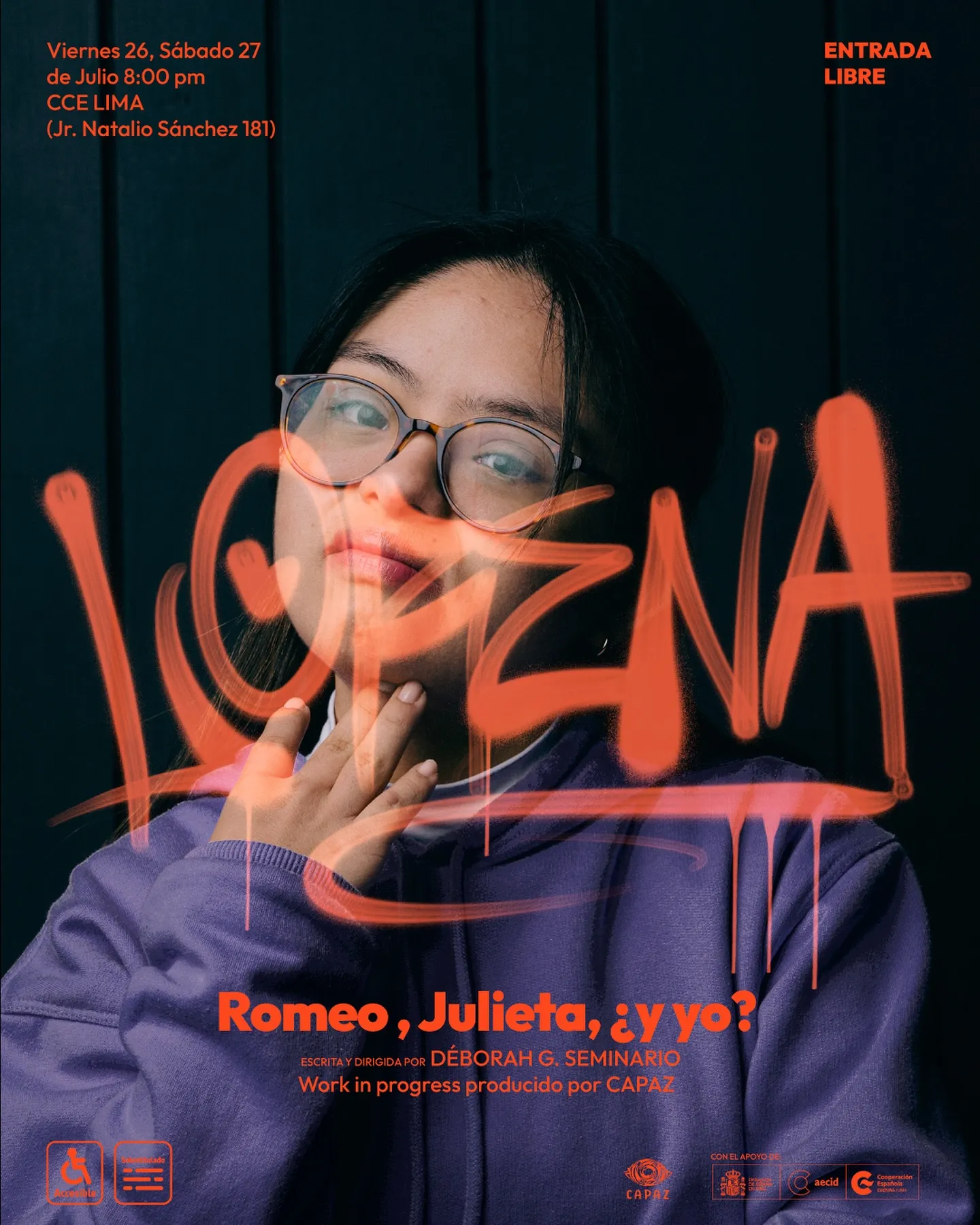 Inspirada en la clásica historia de Shakespeare, Romeo, Julieta, ¿y yo? es una creación colectiva que reinterpreta el amor, el deseo y la amistad desde la experiencia de un grupo de jóvenes con síndrome de Down en diálogo con artistas escénicos sin discapacidad. La obra traslada la historia de Verona a Lima, una ciudad contemporánea, caótica y diversa, donde lxs protagonistas comparten sus búsquedas personales, afectivas y sexuales con humor, ternura y autenticidad.